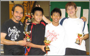 ![]() James Wong with the Champions of the U14 Boys Team event. (from left: Soong Ming Ee, Justin Ong & Graeme Saw) | Gold U14 Boys Sabre Individual Nigel Foo Gold U14 Girls Sabre Individual Silver U14 Girls Sabre Individual Bronze U12 Boys Foil Individual |